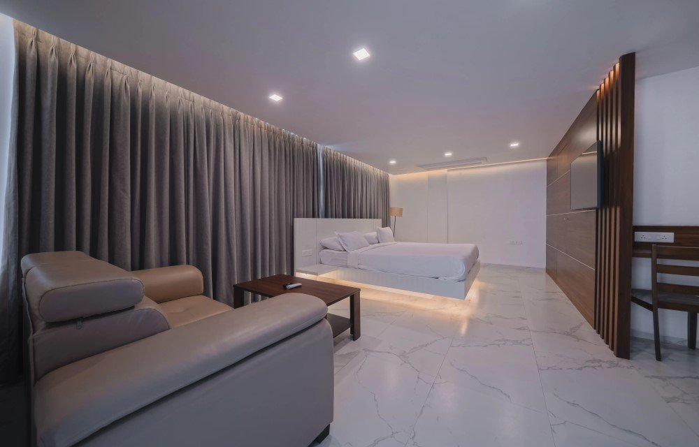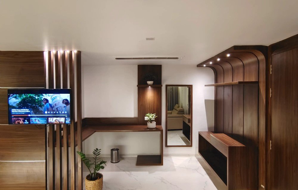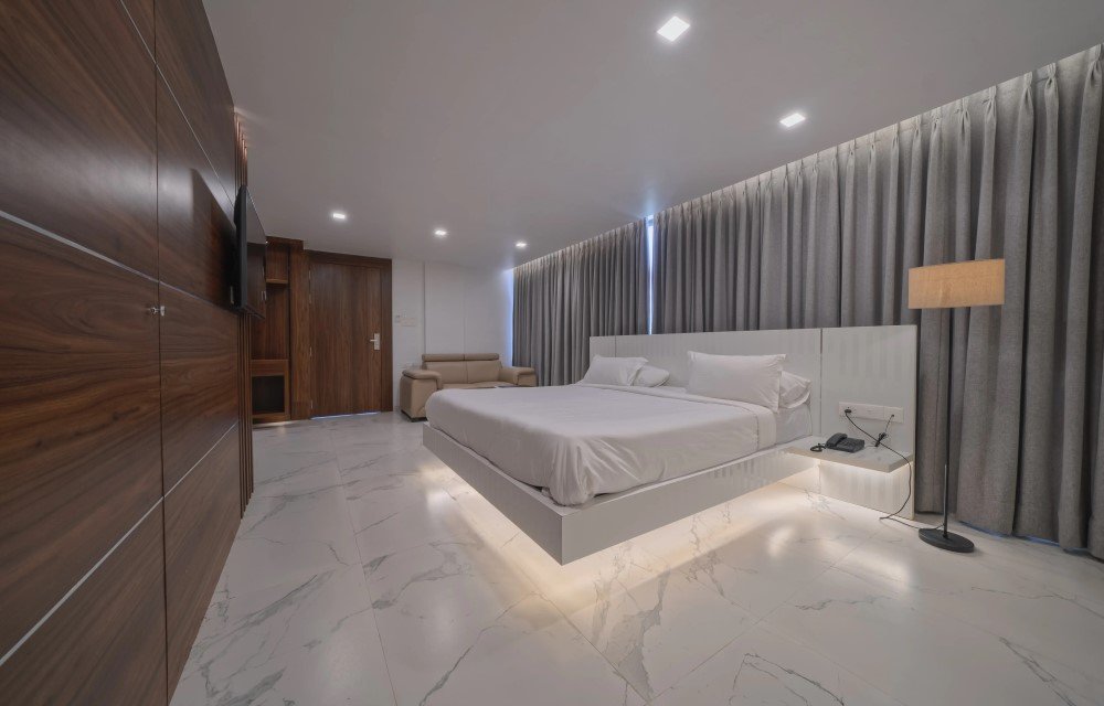 The bed is firm yet comfortable, suitable for guests who prefer proper back support. Soft pillows and clean linen make it a reliable choice if you are booking a comfortable hotel room near Rushikonda Beach Road. After spending time outside, coming back to a quiet studio stay in Visakhapatnam feels relaxing.
