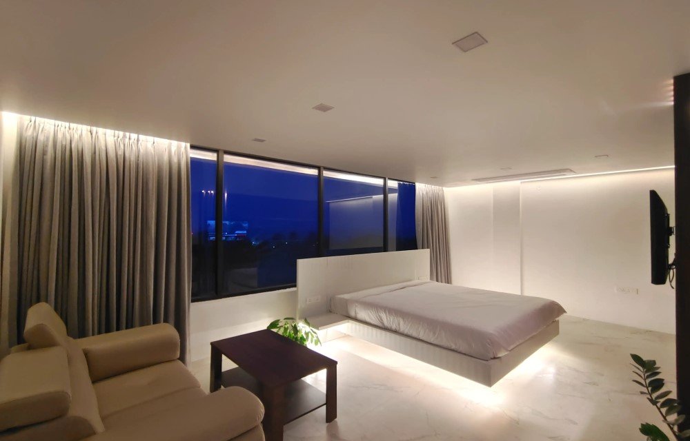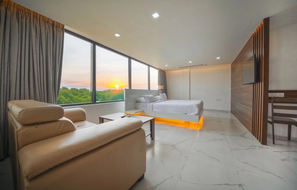 One of the highlights is the window placement. It allows sunlight during the day and fresh air circulation, giving you a bright and airy studio near Rushikonda coastline. The partial sea view adds charm without the premium cost of a full-facing room, making it a value stay with beach glimpse in Visakhapatnam.